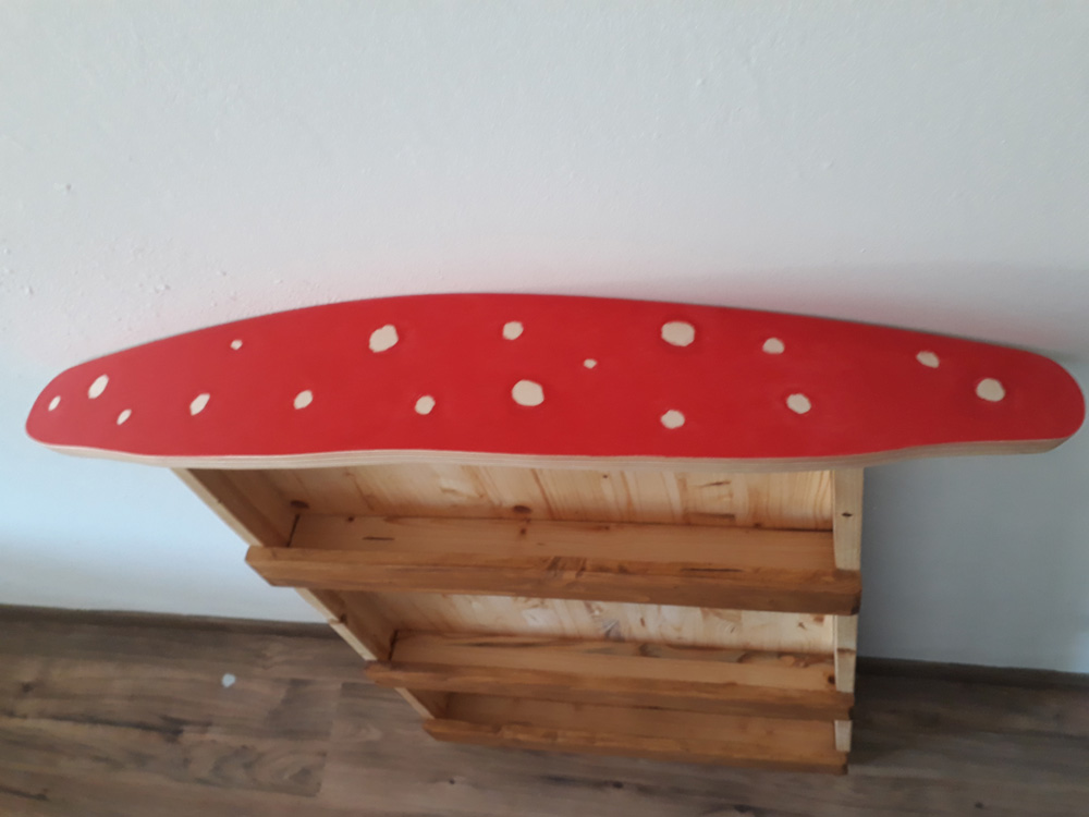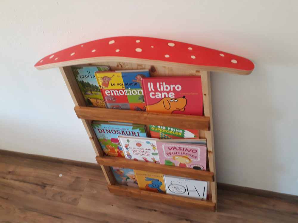 Libreria per bambini a forma di fungo in abete massello italiano e pioppo.