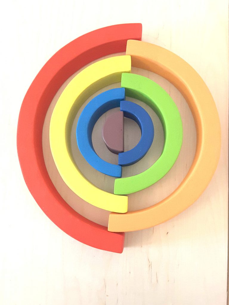 Gioco motorio per bambini utile per stimolare le capacità e la fantasia permettendo di riconoscere le forme ed i colori. Ogni parte può essere impilata l’una sull’altra in ordine crescente fino a creare un arcobaleno.