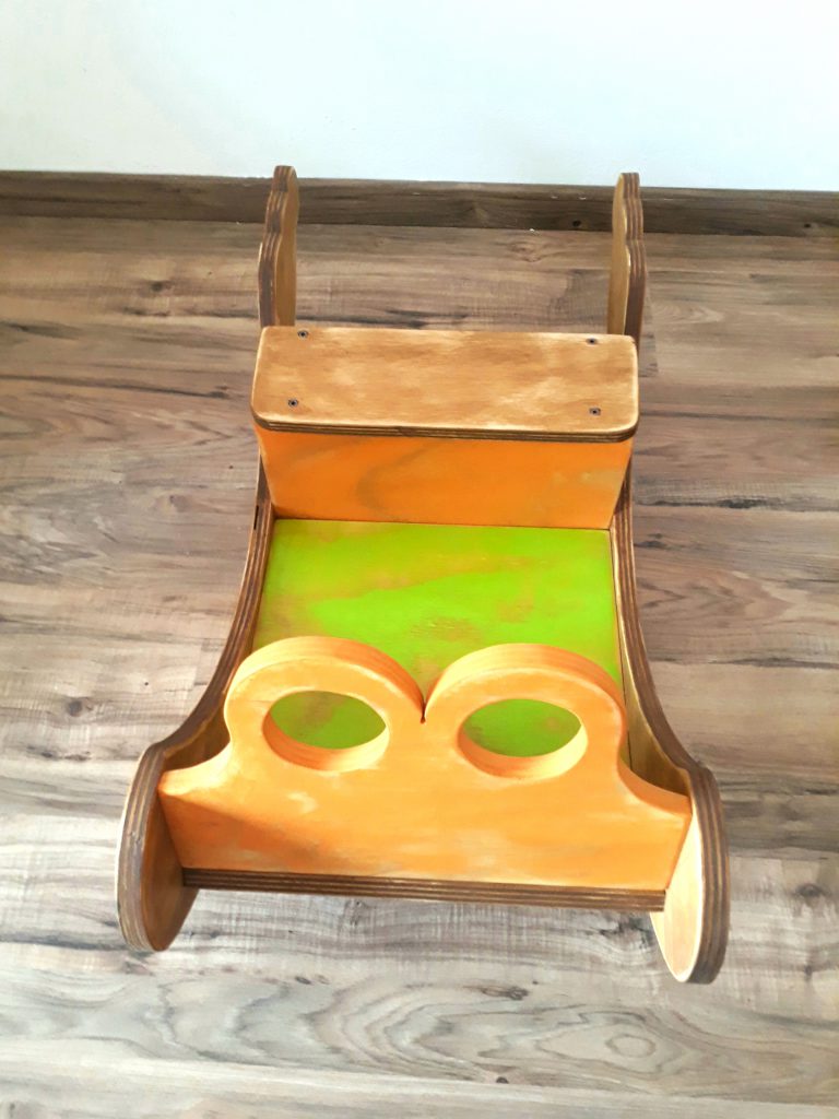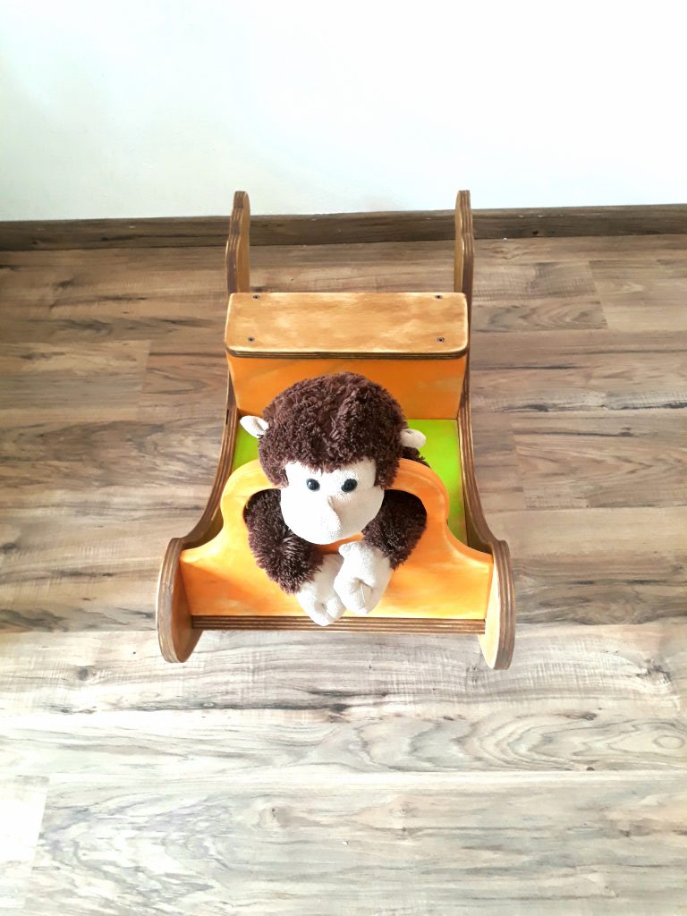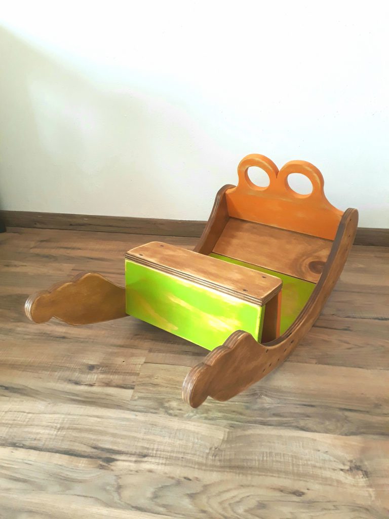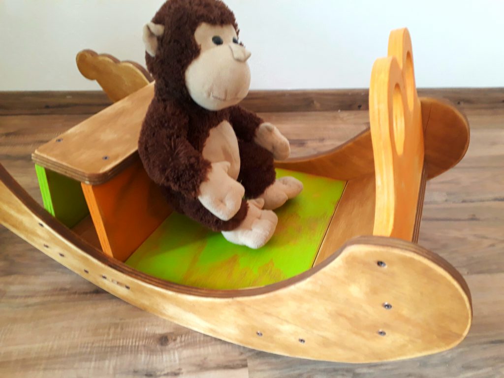 Verniciato in tre colori diventa un passatempo divertente per i piccoli che desiderano provare un po’ di ebbrezza o allo stesso tempo rilassatezza dondolandosi semplicemente. I due fori nella parte anteriore oltre a ricordare gli occhi di una rana servono soprattutto come maniglia/appiglio per le mani.Facendo forza su questi si può diminuire o aumentare la velocità del dondolio.