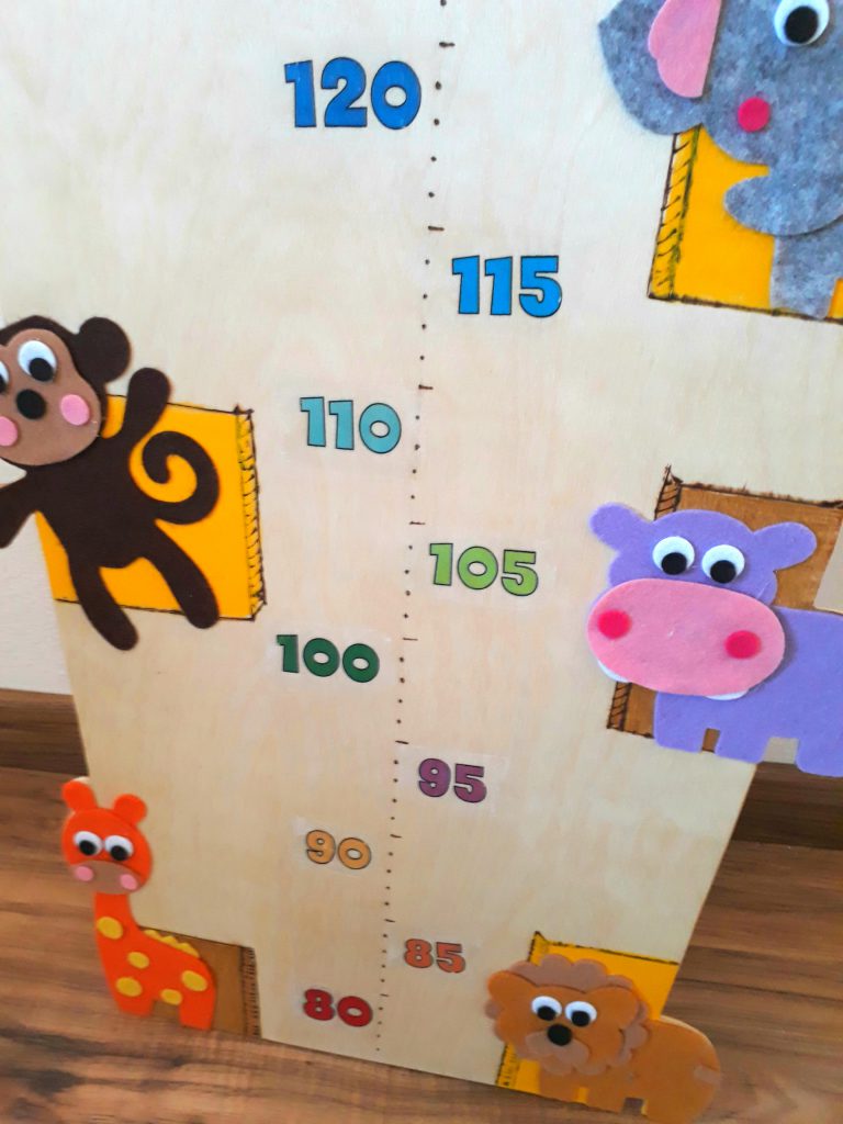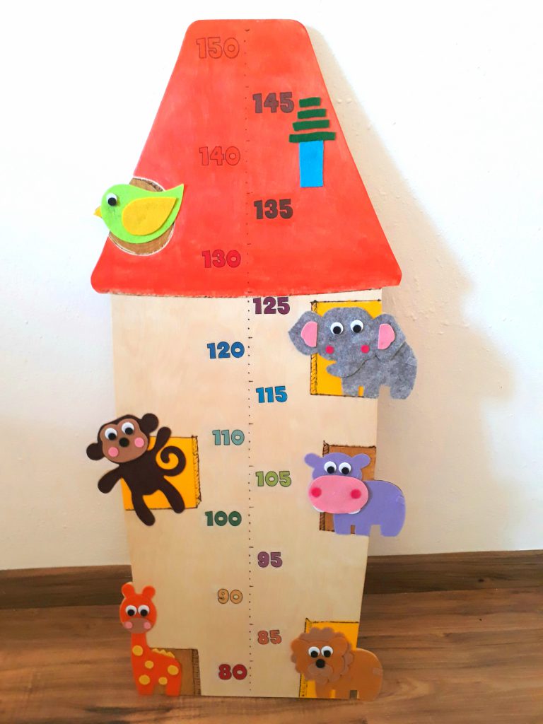 Ecco un misurabimbi a forma di casa degli animali in legno di betulla con numeri stampati e trasferiti su legno.