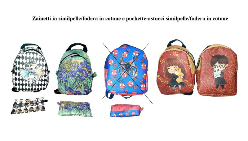 - Materiali: similpelle, cotone, gancetti, fettuccia, cerniera